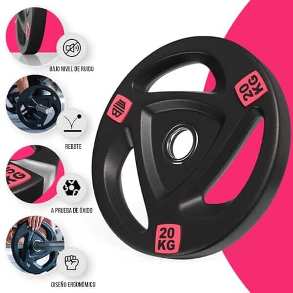 • PhysKcal Disques de Poids Olympiques 1 x 20 kg avec Finition en Caoutchouc, Ouverture de 5,1 cm et Trois poignées, disques d'haltères Noirs pour Levage et Musculation, Ensemble de Poids en Fonte